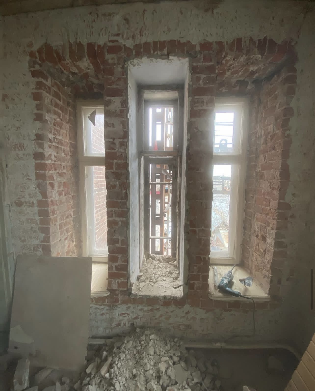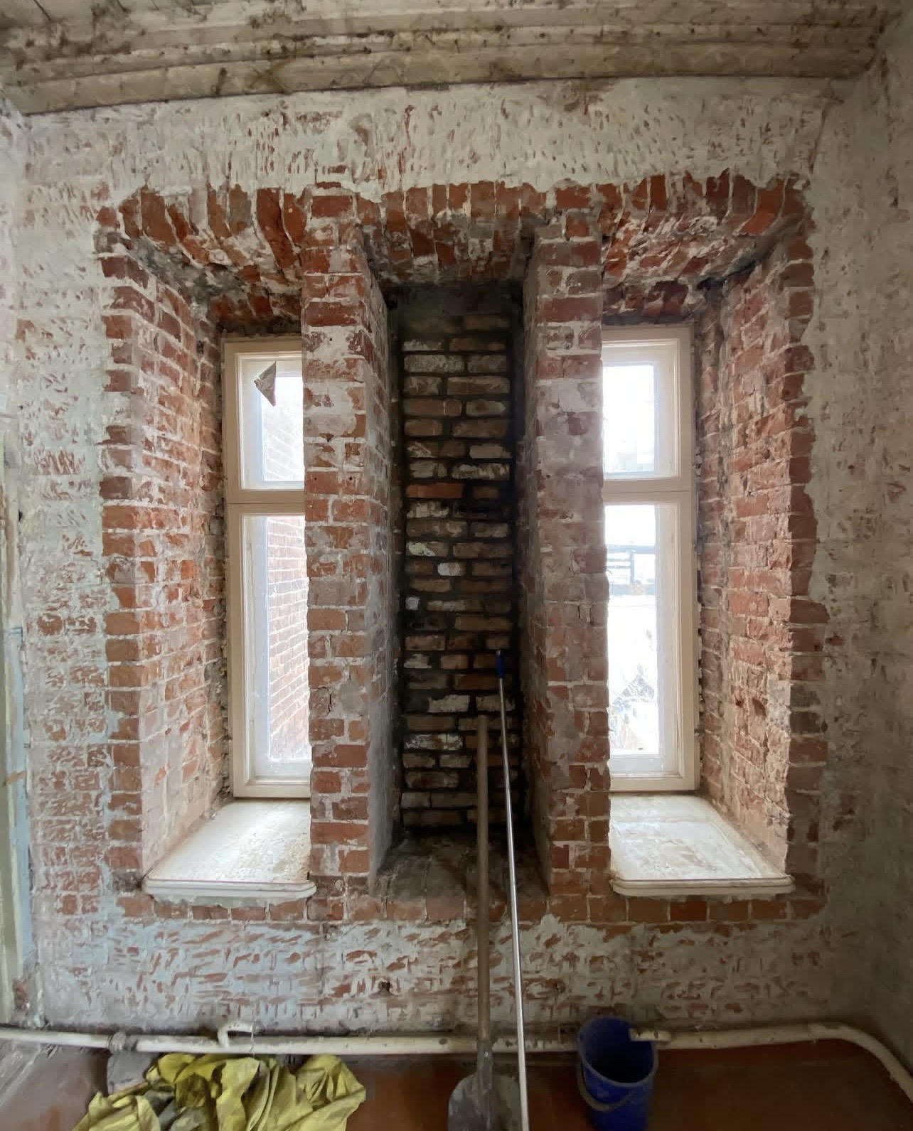 То же самое случилось с большим арочным окном, таким же как на 3 этаже. Его заложили кирпичами (ладно хоть не силикатными). Конечно, приняли решение его спасти, на сколько возможно. Позже покажу, как мы это делали❤️🔥