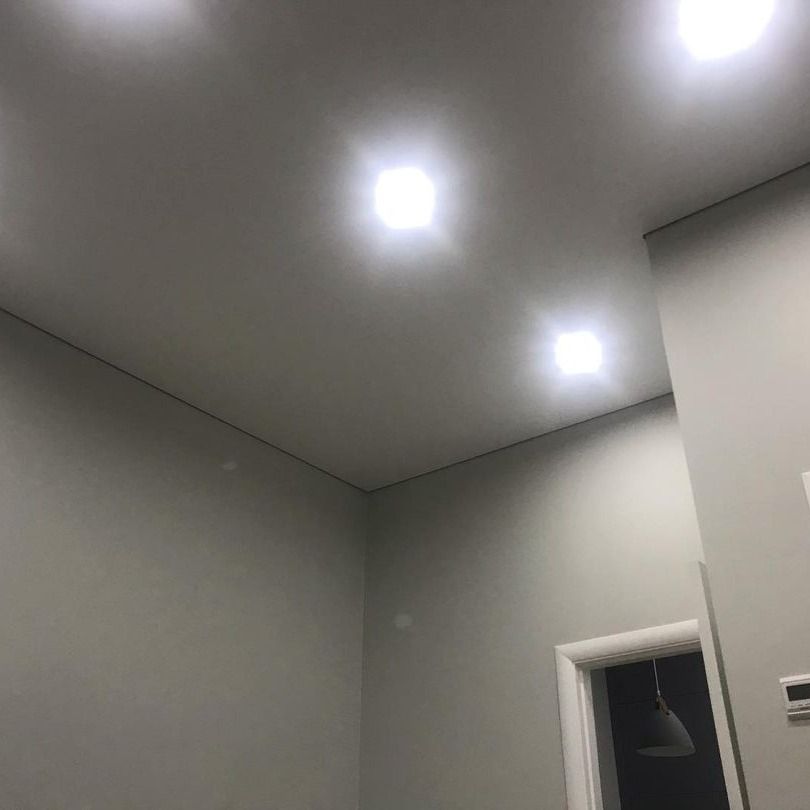 Когда полотно натянулось, я вставил светильники обратно в те же отверстия. Включил свет - потолок снова стал белым и ровным. Желтого пятна не осталось. Полотно больше не провисало.