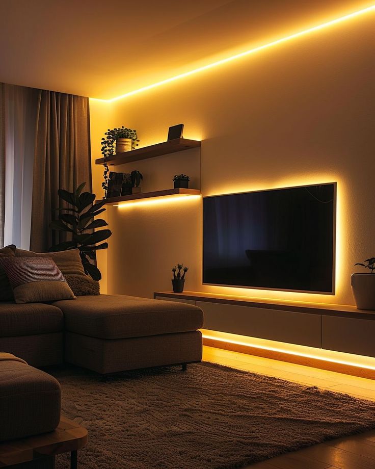 Нижний уровень - это подсветка. Светодиодная лента за телевизором или под мебелью. Она не освещает комнату в привычном смысле, но создает атмосферу и снимает контраст между ярким экраном и темнотой. Глаза благодарят.