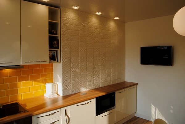 Кухню я делала полностью сама, и это была настоящая работа с душой и терпением. Гарнитур выбрала бежевый( мягкий, спокойный оттенок, который хорошо сочетается с яркой жёлтой плиткой в виде кирпича возле плиты.)