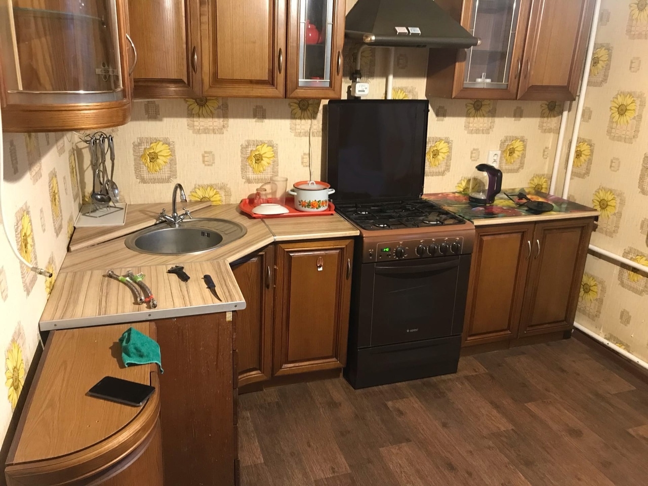 Обои в крупный цветок. Люстра с плафонами-«тарелками». Линолеум, который помнит дефолт. Дверь на кухню закрывается только если приподнять ее за ручку и одновременно толкнуть плечом.