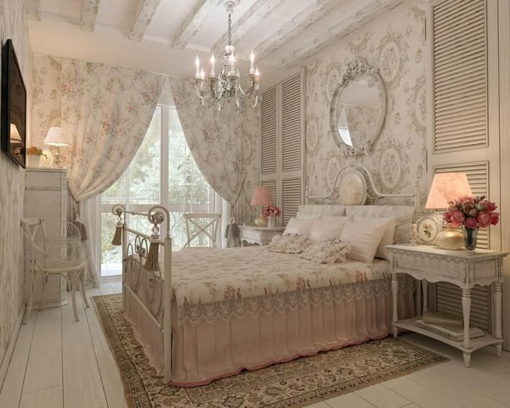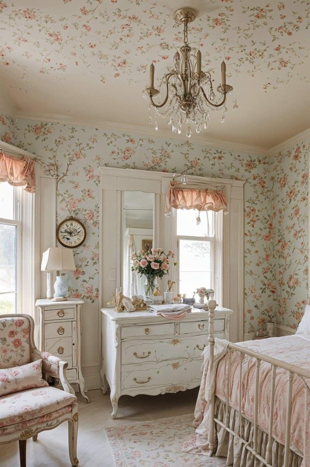 Стены окрашены в нежные кремовые, розовые или мятные оттенки, иногда с лёгким цветочным принтом.