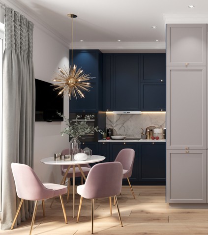 Кухню мы с дизайнером полностью переделали, и теперь она совсем другая. Добавили синие акценты в виде кухонного гарнитура.