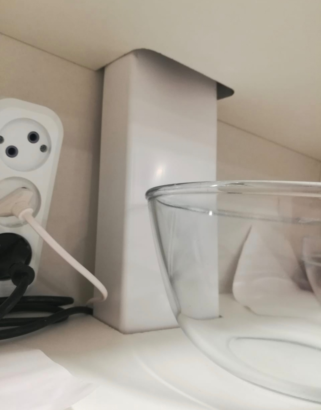 Делали вытяжку. Вырезали так себе под трубу, мне кажется. Из-за неё сузился шкаф в антресолях. Но, зато не видно