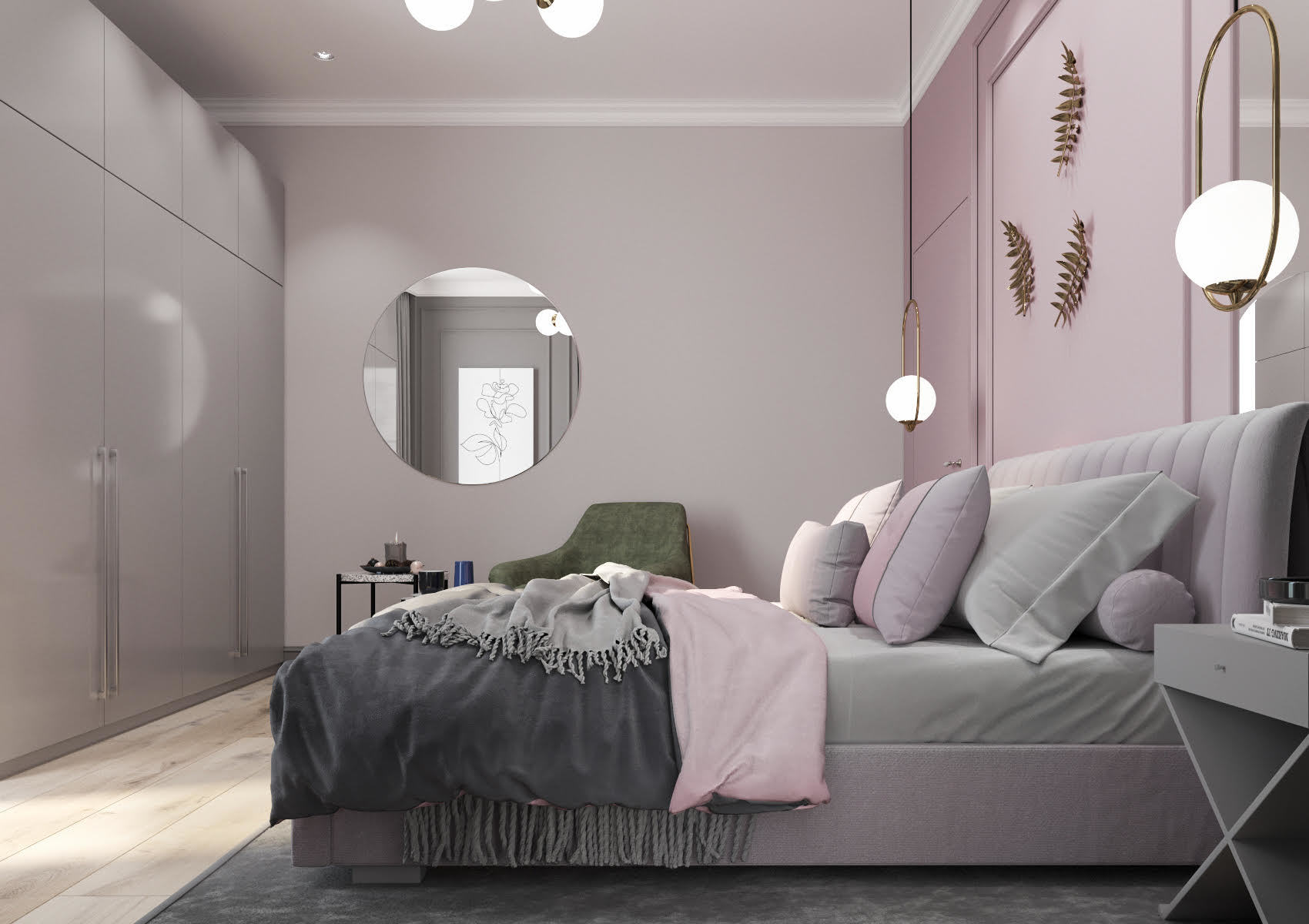 Моя спальня. Стены в нежной пастельной розе,как и в коридоре, а шторы почти сливаются с акцентными серыми стенами.несколько источников света, а из сте...