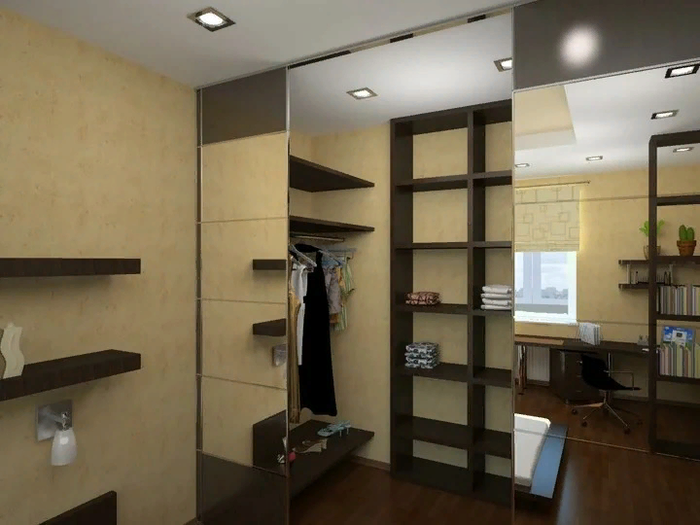 Огромная кладовка между гостиной и спальней может быть преобразована в современную гардеробную. Идея: разделить помещение на две части и сделать два входа. Первая зона со стороны спальни для домашней одежды. Вторая со стороны коридора для уличной одежды. Также важно продумать размещение полочек и зеркал: большое зеркало на двери помогает экономить пространство и облегчает сборы. Полочки можно сделать самостоятельно из гипсокартона — экономично и удобно. Советы: Не...