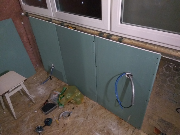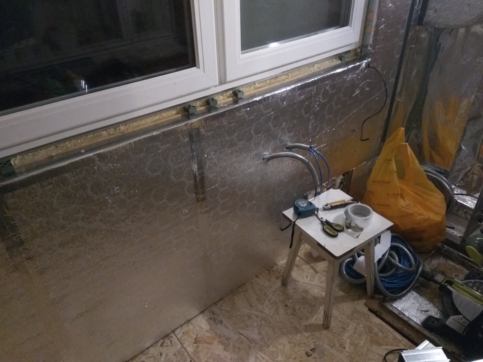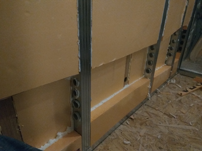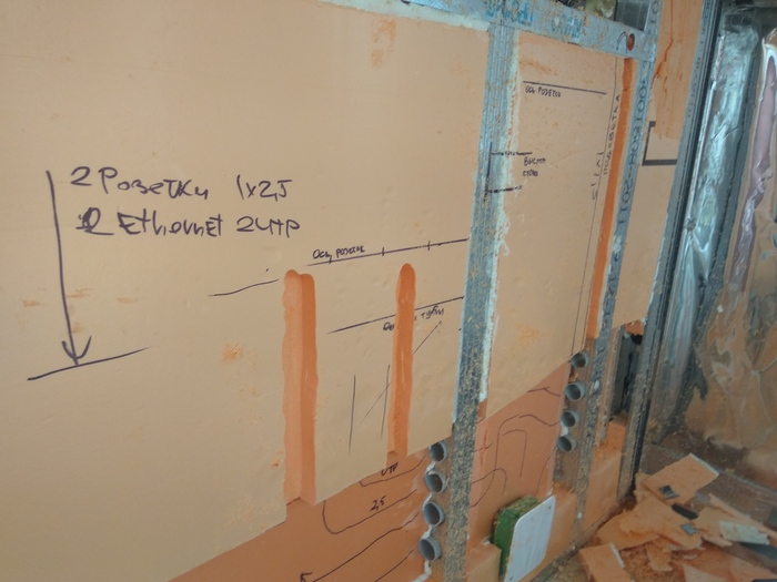 Когда каркас парапета был готов, наступило время его утеплять. Однако, я дополнительно хотел провести там электрику, так как там в дальнейшем будет рабочее место, а значит нужны разные розетки, выключатели и прочее. Вырезаю листы, пеню, вставляю. Прорезал отверстия для пропуска металлорукава с проводкой и вставил туда куски ПВХ трубы, чтобы рукав не терся об острый край профиля. Тут точность не нужна, делал на глаз, так что все криво. Делаю разметку, где какие точки...