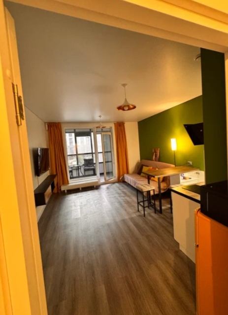 Важным нюансом квартир под сдачу является отделка максимально ударопрочными материалами. Плитка при входе на балкон, керамогранит - на полу. В данных апартаментах оригинальное решение с уличной стеной. Графичная разметка с сочетанием темно-коричневого и теплого бежевого оттеняет сочные цвета в отделке комнаты.