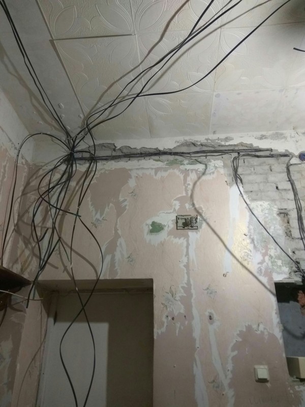 Креплю всё на клипсы. простое решение, но работает нормально. Когда стоишь с этими проводами, начинаешь понимать, насколько важно всё продумать заранее. Ошибся сейчас.. потом штробить, переделывать, пыль, грязь по новой… не хочется. Потихоньку начал готовить стены. Счищаю всё лишнее, выравниваю, подготавливаю под белизну и грунтовку. Работа муторная, честно.
