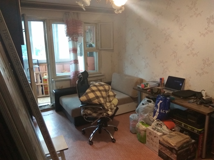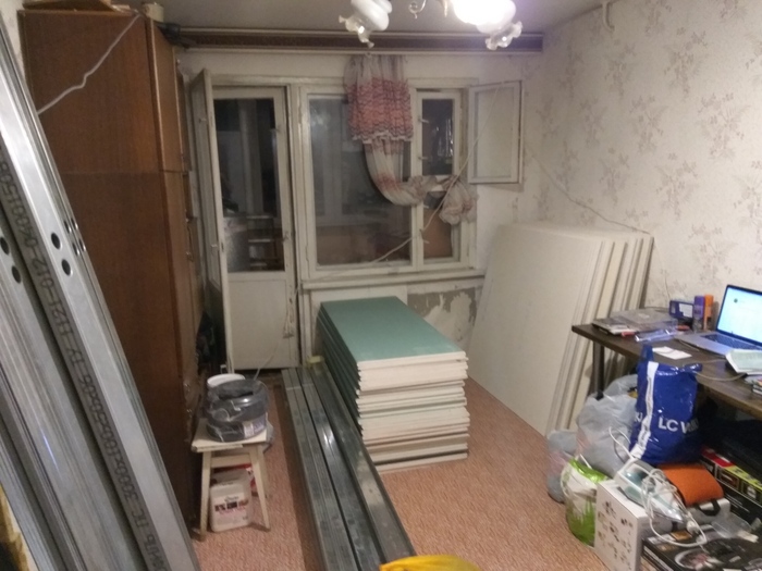 Тут на фото я уже начал собирать вещи из шкафов, потому что этим секциям в новом ремонте места не было, да и сильно они мешают в процессе. На балконе виден склад материалов, ну и профиль штабелем стоит. Решил вывезти три из пяти секций, а также оба дивана. На самом деле это один диван, просто две его половинки.