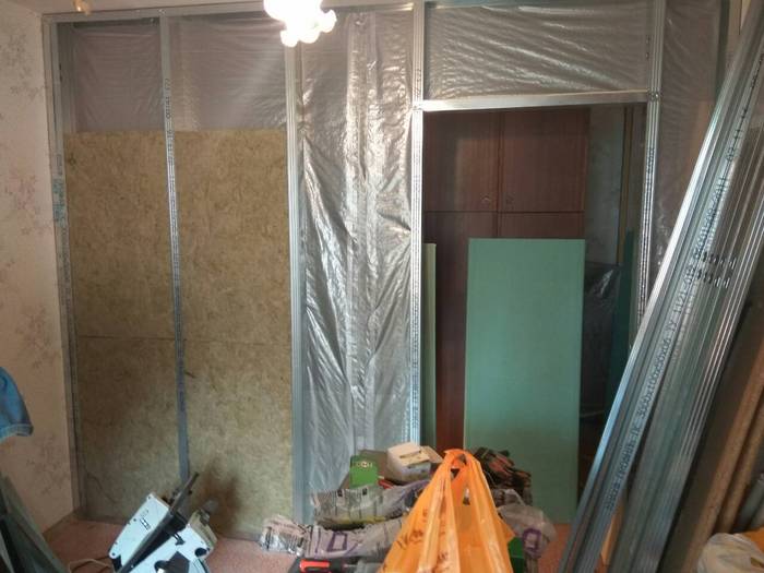 Дальше я уже в одну харю приклеивал на двусторонний скотч влаго-пароизоляционную плёнку. Это нужно, чтобы каменная вата не пылила в комнату и находилась в герметичном пространстве, в том числе не набирая в себя никакой влаги. И укладывал шумоизоляцию. В процессе забыл про поперечные профили, но потом это восполнил.
