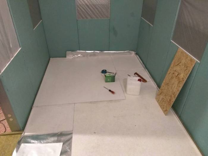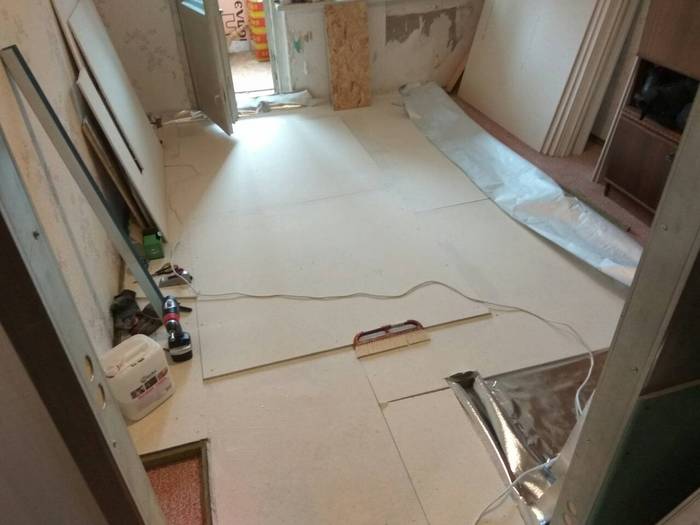 Приступаем к настилу пола. Делал я это по технологии сборной плавающей стяжки. На пол укладывается сэндвич. Первый слой это шумоизоляция. Второй слой это пароизоляционная отражающая плёнка. Третий и четвёртый слои это листы ГВЛВ. Они укладываются со смещением, проклеиваются между собой обычным ПВА и скручиваются специальными шурупами. У этих шурупов двойная резьба и коническая форма шляпки.