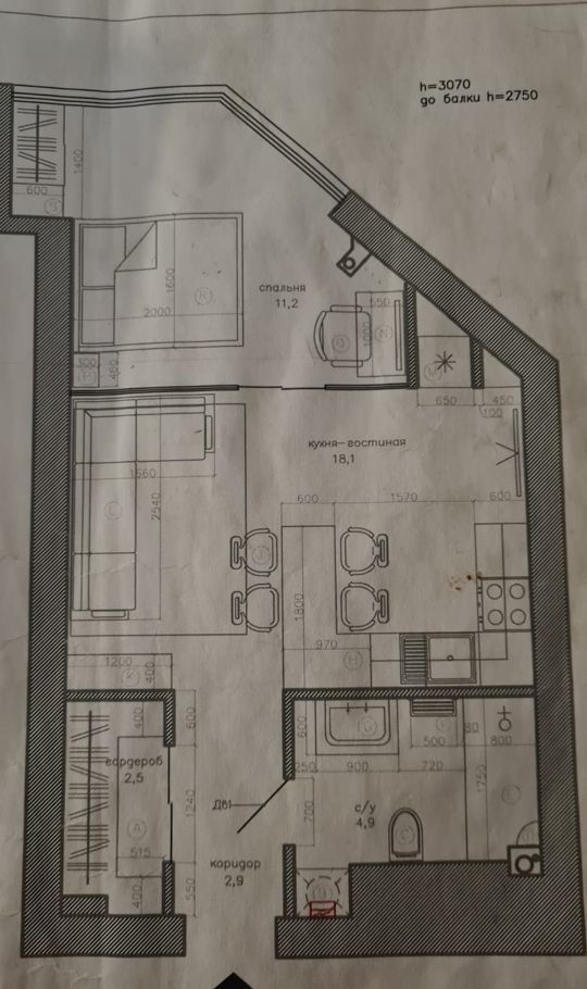 Чтоб стало понятнее, это план квартиры. И вот как раз в угловой части спальни уместился небольшой фигурный столик для организации рабочего места. Чисто под ноут.