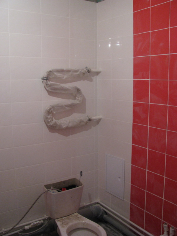 Паяем трубы, кладём плитку, прокладываем канализацию, кладём плитку. И вот уже почти плитка закончилась, бац, ниша для стояков. Бросаем гребёнку, берёмся за гипрок.