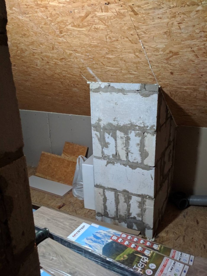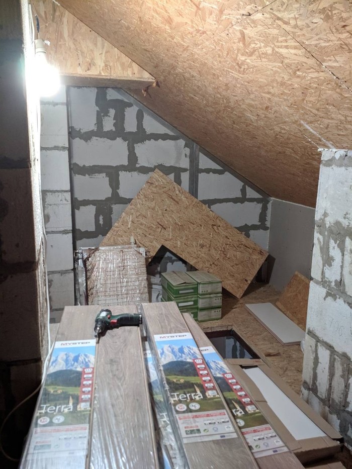 Вот фотографии уже зашитого чердака. Там у нас хранится ламинат, плитка, клей и радиаторы от застройщика - надеемся их продать. Они сухие внутри, в плёнке от производителя и с регуляторами поступления воды.