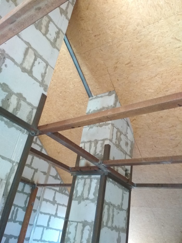На фото - вид на чердак с детской (в детской потолок так и останется склоном). На заднем плане внизу видно кухню. Весь чердак занял ванную, туалет и коридор.
