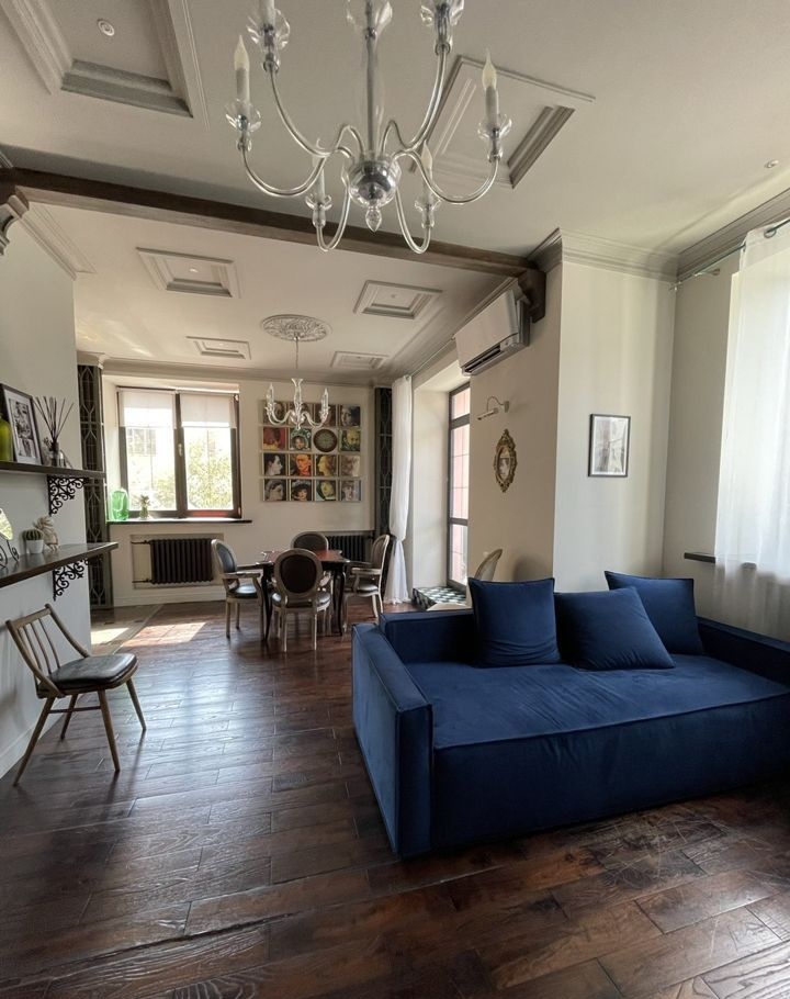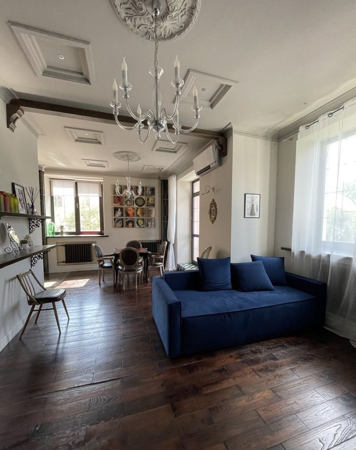 Стартовой позицией было оформление графичных квадратных элементов на потолке, с лепниной и покраской. Их расположили симметрично розетке с люстрой. Потолки высотой 3 метра. Стены просто выкрашены краской, решили их оставить в таком виде.