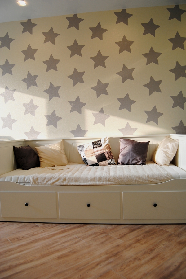 Начала со стен. Решила сделать акцент: одну стену под окном покрасила в голубой, и ещё у двери тоже сделала голубые участки. Долго подбирала оттенок, чтобы он был не слишком яркий, но и не скучный. Параллельно делала ещё одну стену,белую с серыми звёздочками. Звёзды рисовала сама