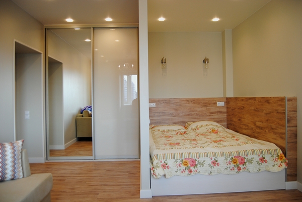 С мебелью, как обычно, всё через замеры и постоянные примерки. Сделали встроенный шкаф в стену.. долго рассчитывала размеры, чтобы он не съел пространство, но при этом был вместительным. С кроватью определялась еще дольше,чем с собственной.