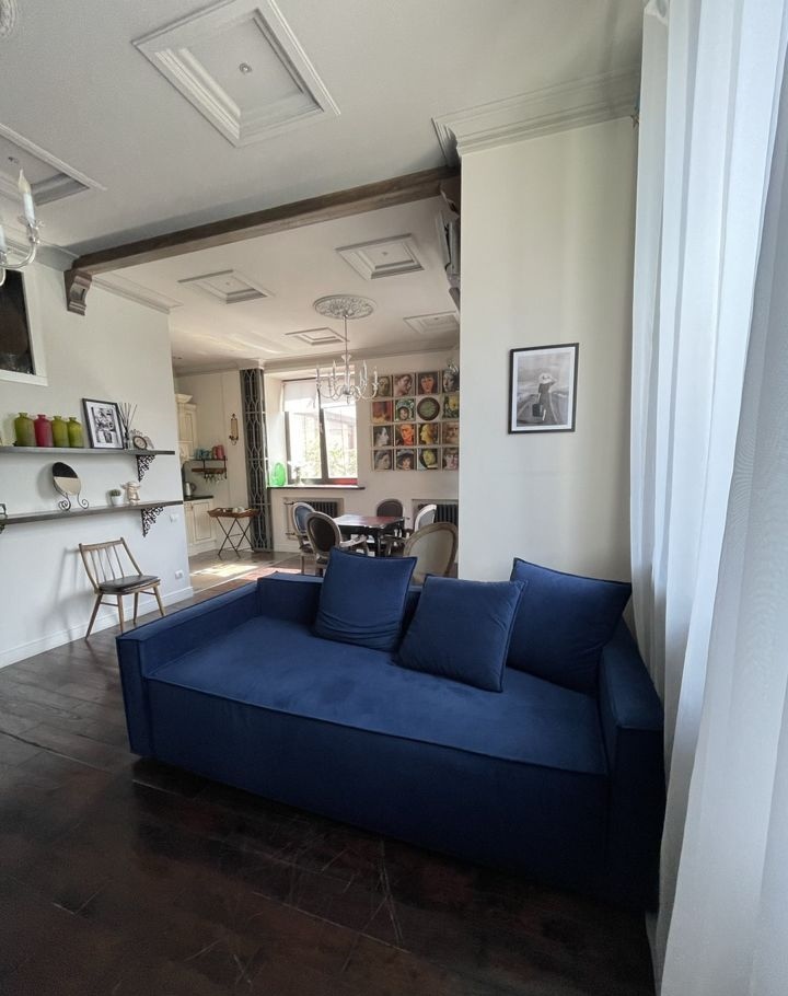 Уже я думаю вы нагляделись на чернильный бархатный диван простой формы. Это конечно решение спорное, он не особо нам подходил, единственным его достоинством стало то, что он представляет собой яркое пятно. А его нам как раз тут и не хватало. кроме того, диван вместе с поперечной балкой незримо отделяют зону кухни от зоны гостиной.