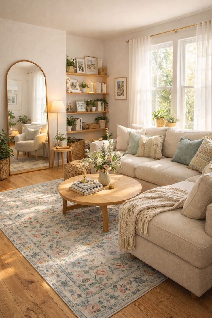 Мебель функциональная и простая: диван лаконичный, столики аккуратные, шкафчики без лишних украшений. Но именно простота создаёт гармонию
