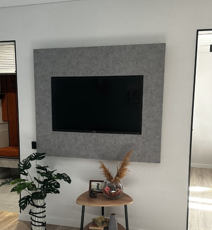 Так как кухня у нас из проходной комнаты, сквозная, то два проема сделали одинаковыми. Телевизор установили на панель под бетон. Такую же панель сделали на стене напротив, возле дивана.