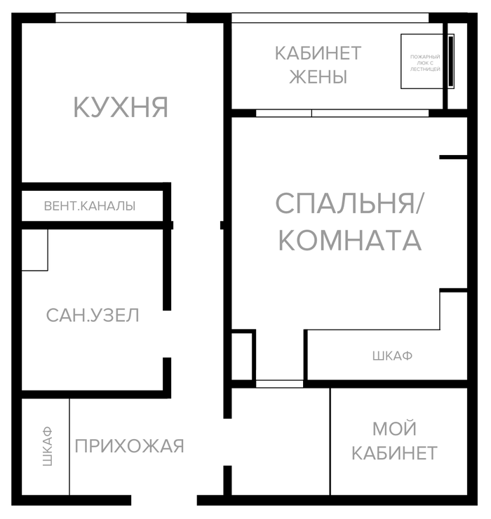 Третье, пространство. Комната одна, но большая. Плюс большой балкон. Жена работает на дому. Мне нужно личное пространство, ей своё, плюс адекватная кровать, и уже всё, места не остаётся. Нужно продумать эффективную планировку.