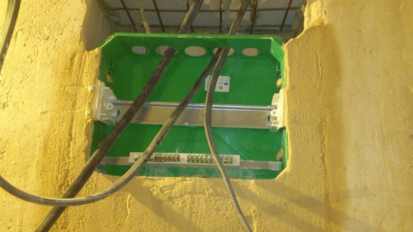 Ниша от застройщика превращена в щит на 12 модулей. На этом этапе тщательно продумал расположение всех розеток, выводов под приборы и витую пару..нудное занятие.