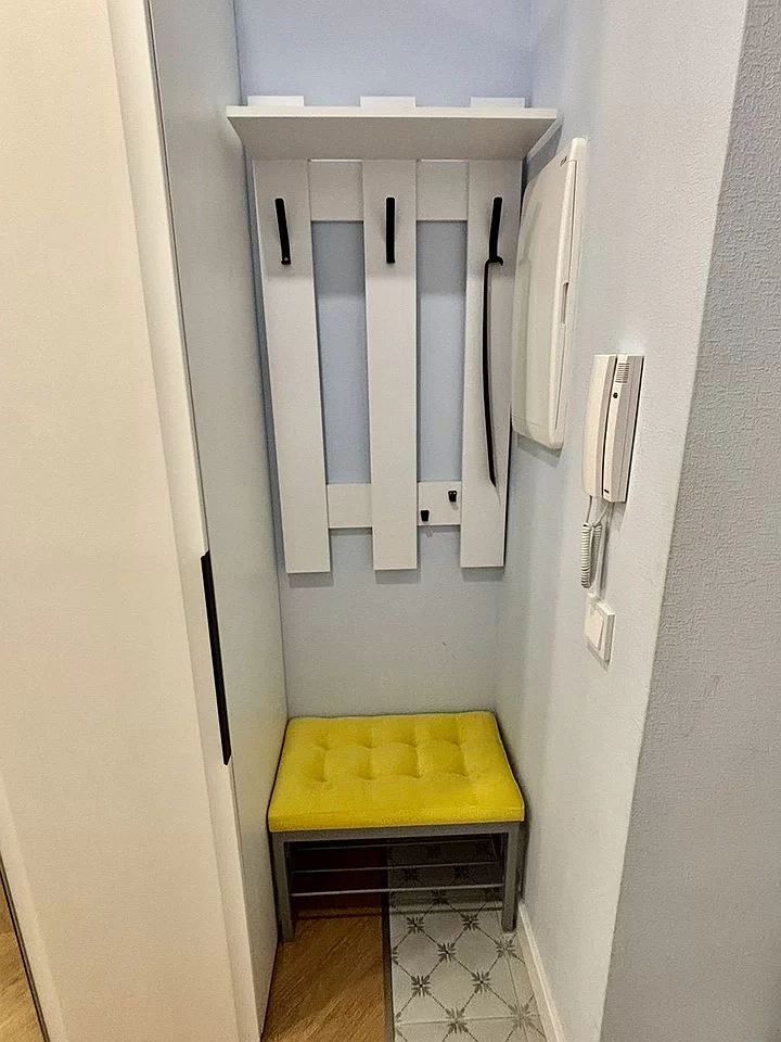 Прихожка тоже не отличается яркостью, ну а куда. Зато уютный уголок с зоной для обувания получился! Я хотела диван с бархатной спинкой, но получилось только сидение сделать. Мне нравится, что одежда, которая будет висеть на крючках, её не будет видно из комнаты.