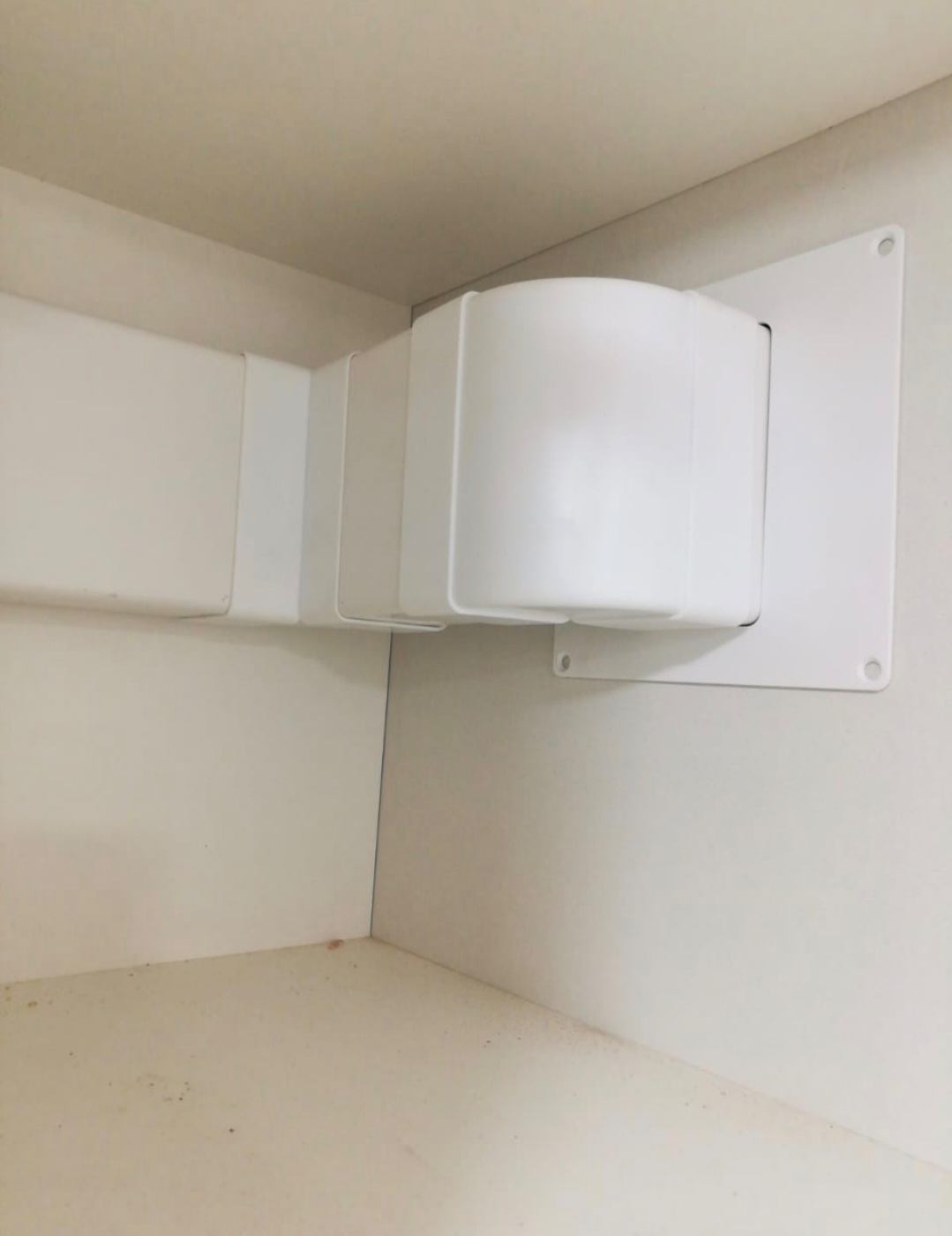 Делали вытяжку. Вырезали так себе под трубу, мне кажется. Из-за неё сузился шкаф в антресолях. Но, зато не видно