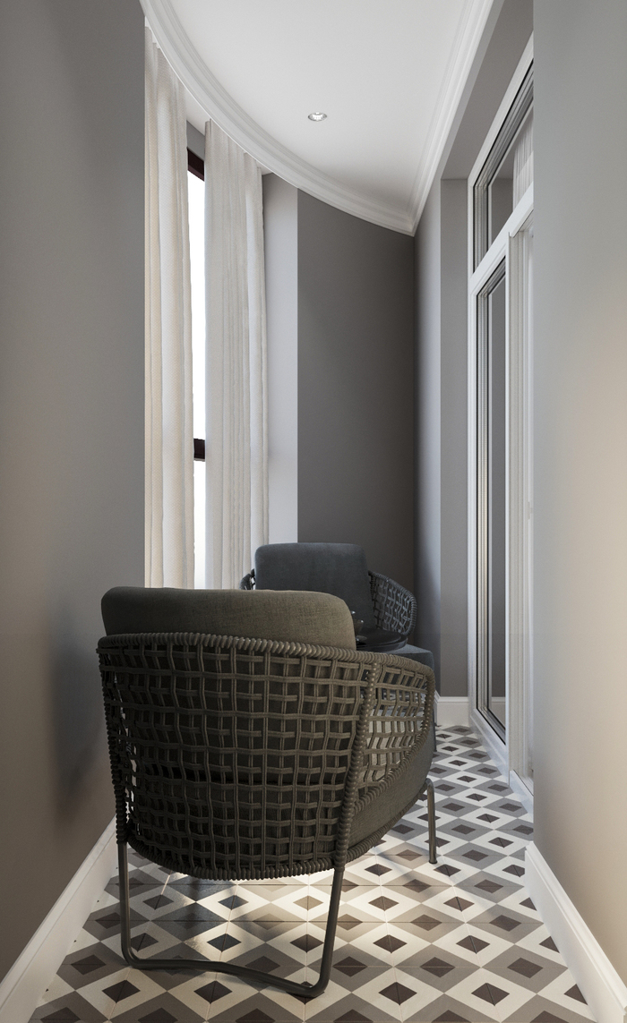 на балконе пол выложен плиткой с интересным рисунком, которая сразу задаёт настроение всему пространству. Балкон закруглённый, а двери полностью стекл...